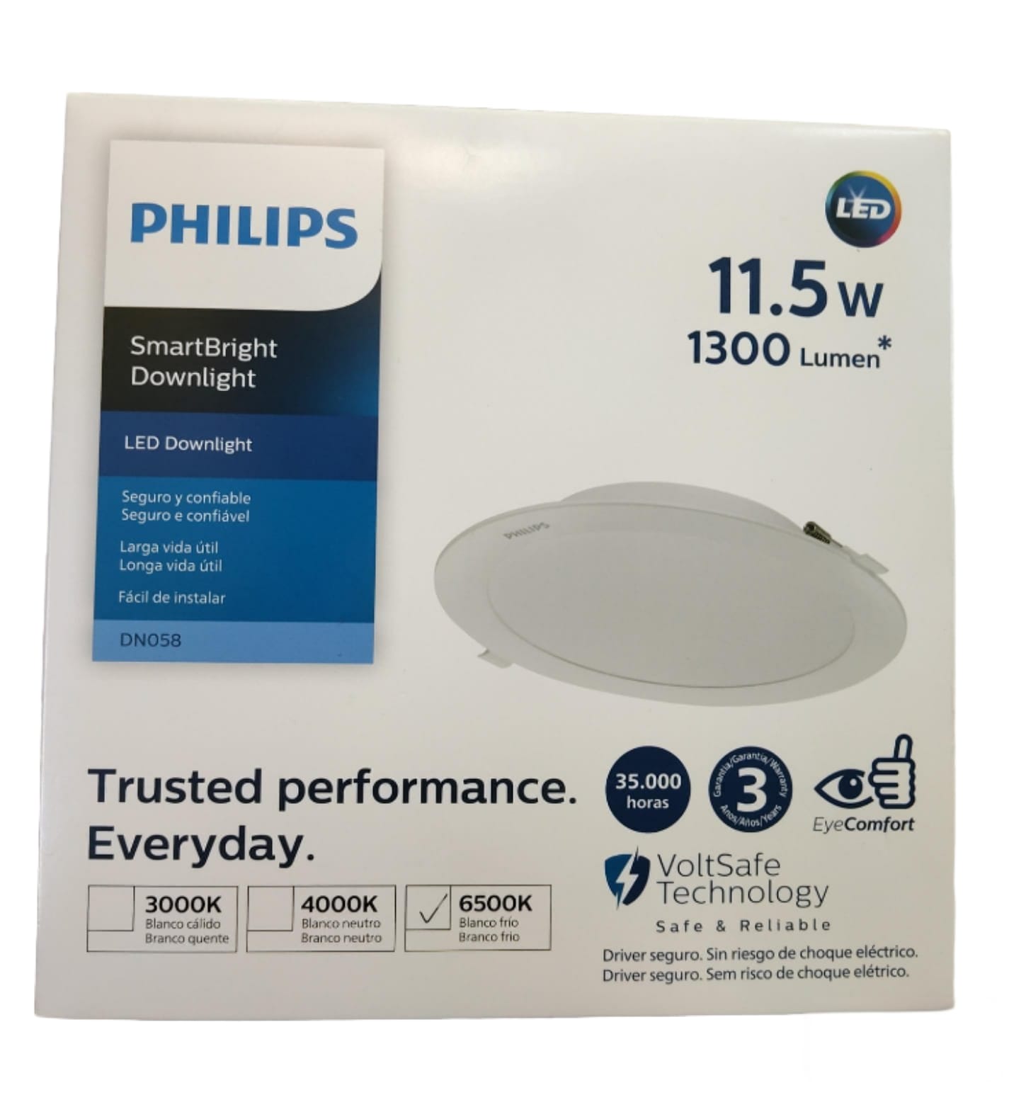 El Downlight Empotrable Philips SmartBright LED 11.5W Modelo DN058 es una solución de iluminación profesional que combina un diseño extra plano con un alto rendimiento. Ofrece 1300 lúmenes de luz blanca fría (6500K), ideal para espacios de trabajo y comercios. Gracias a su tecnología EyeComfort y VoltSafe, garantiza una visión sin fatiga y una protección superior contra fluctuaciones de voltaje, respaldada por una vida útil de 35,000 horas. Encuéntralo en www.dimatel.com.pe.